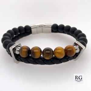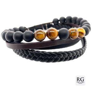 S/STEEL ONYX+TIGERS EYE BL+BR BRAID LEATHER BRACEL