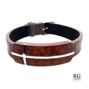 S/STEEL CROSS LEOPARD WOOD BROWN LEATHER BRACELET