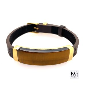 S/STEEL YG PL TIGERS EYE BROWN LEATHER BRACELET
